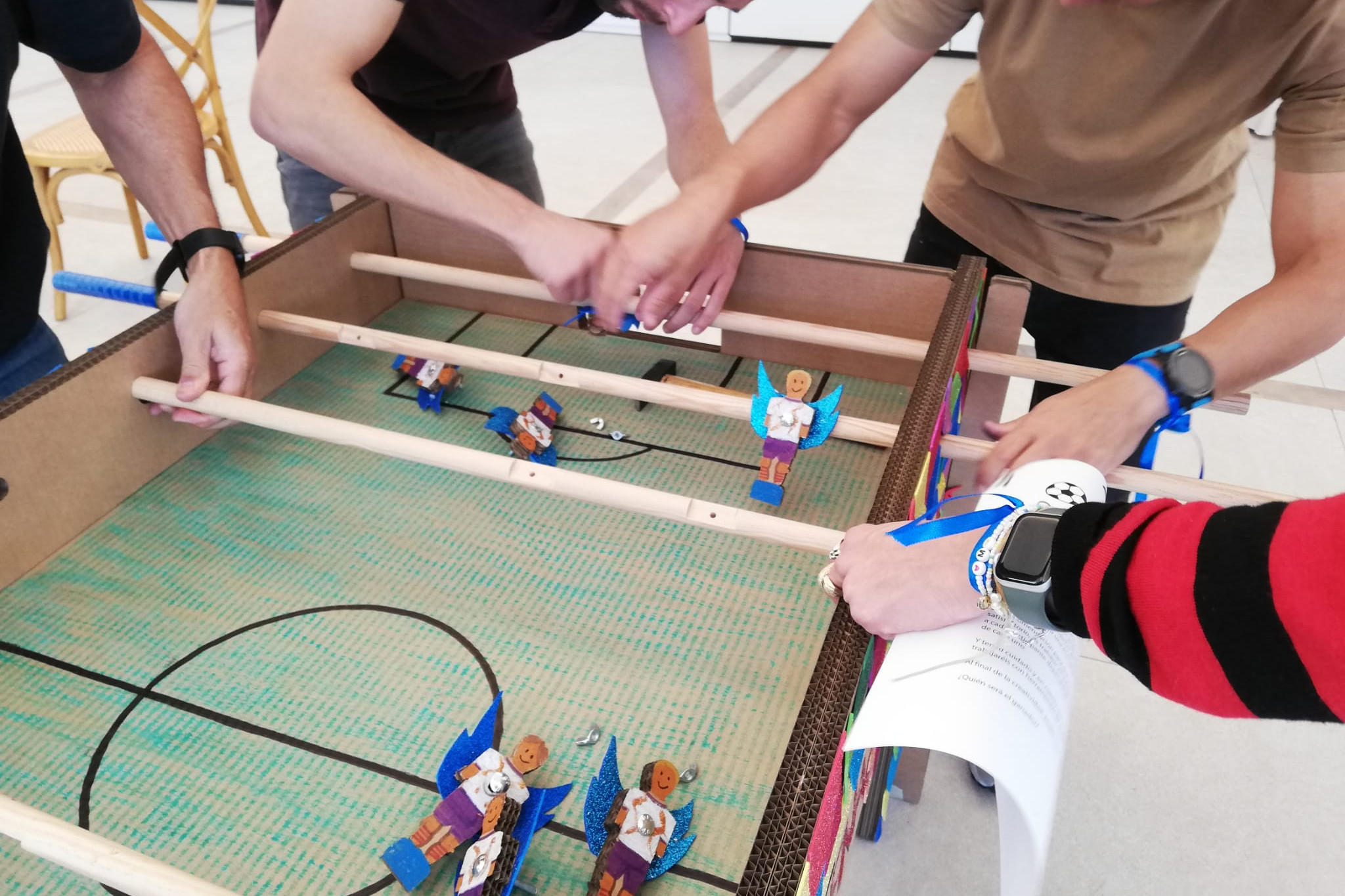 Una vez presentada la actividad al grupo, los participantes se dividen en equipos y se distribuyen en sus mesas donde tienen todo el material necesario. Luego diseñarán y crearán sus futbolines y finalmente se realizará un cierre por parte de la ONG seleccionada.