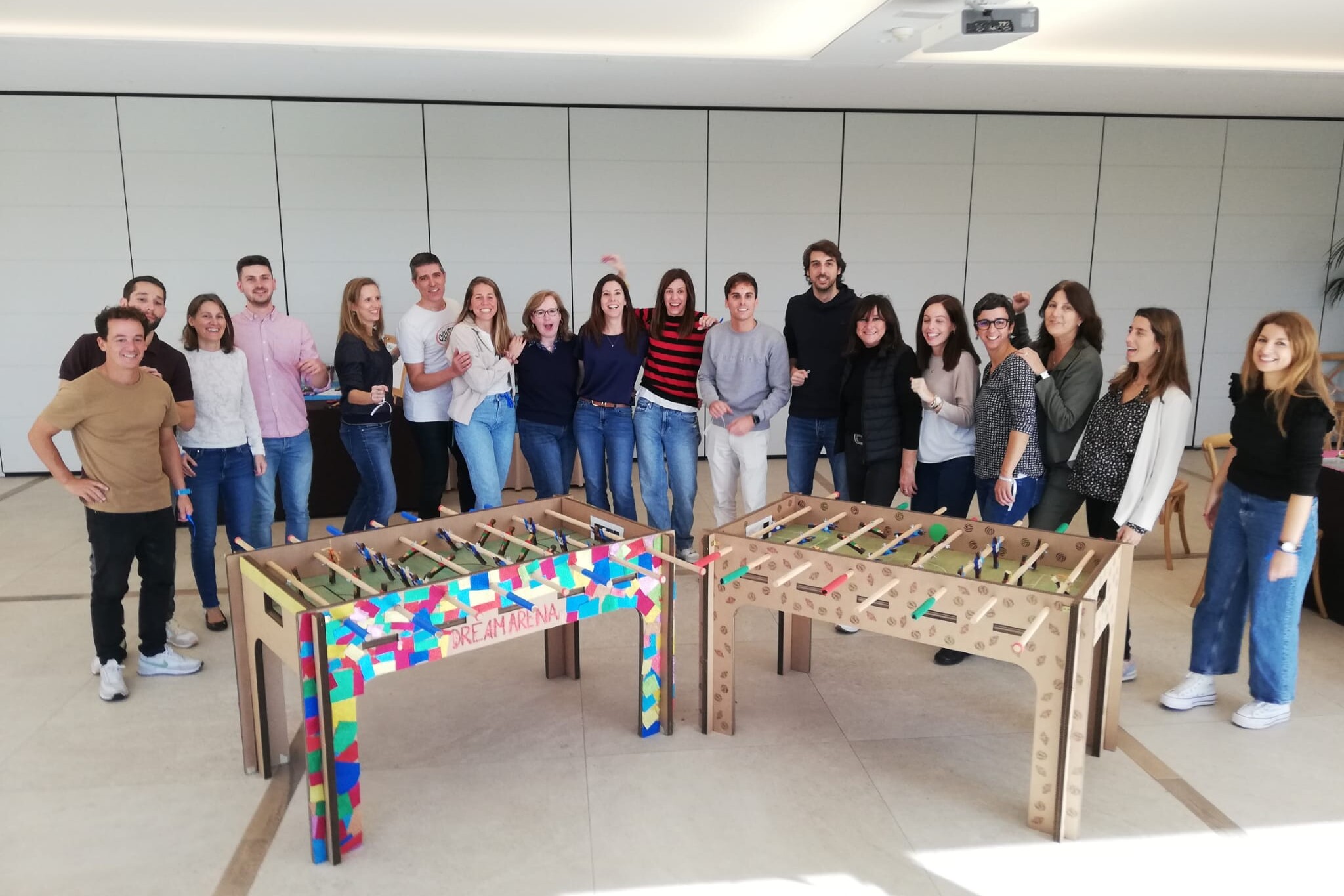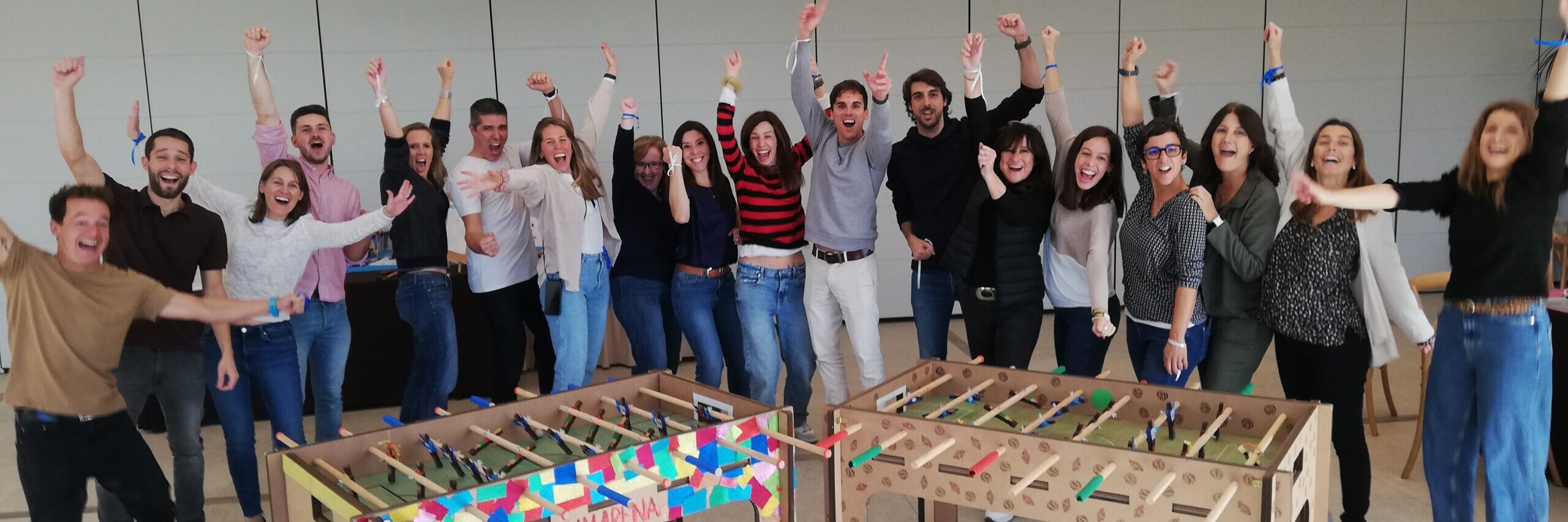 Para la farmacéutica Almirall realizamos nuestra actividad estrella Futbolink, con la que los participantes se divirtieron en equipo construyendo futbolines de cartón para luego donarlos a una asociación.El grupo, dividido en equipos, diseñaron y elaboraron pieza a pieza los futbolines, pintándolos, customizando cada detalle desde los jugadores de cartón hasta el mismo campo de futbol.Al finalizar los futbolines, realizamos un torneo muy divertido del que obtuvimos un equipo ganador. Y, como colofón final, la farmacéutica donó los futbolines a una entidad social, haciendo esta experiencia memorable.